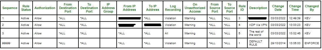 - sequence 3 monitors the rest of the world logging all access as a warning (I also have an immediate alert set up if any access comes in via this rule). Once tested I will set 'On Unauthorized access' to REJECT. Note: our service providers layer 1 blocks all traffic anyway. This adds another layer of protection.