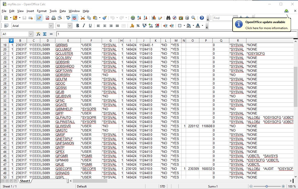 I've then run a command that copies that data from that database file into a csv file in my default folder in the IFS. So far so good - I'm only using what I am authorized to use. Then I upload that newly created text file to my PC and open it with Open office calc.